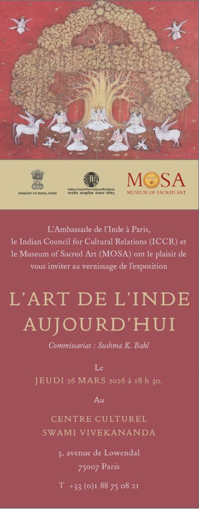 We are pleased to announce the opening of the exhibition “The Art of India Today”, organized by the Embassy of India in Paris, the Indian Council for Cultural Relations (ICCR), and the Museum of Sacred Art (MOSA).